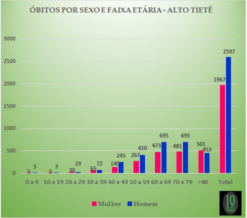 Entre os óbitos registrados até hoje, a maioria ocorreu entre os homens, sendo 2.597 no total, o que representa 56,8% das vítimas fatais da região. A maioria das vítimas pertencia à faixa etária de 60 a 79 anos. Já nas mulheres a letalidade é maior a partir dos 80 anos.